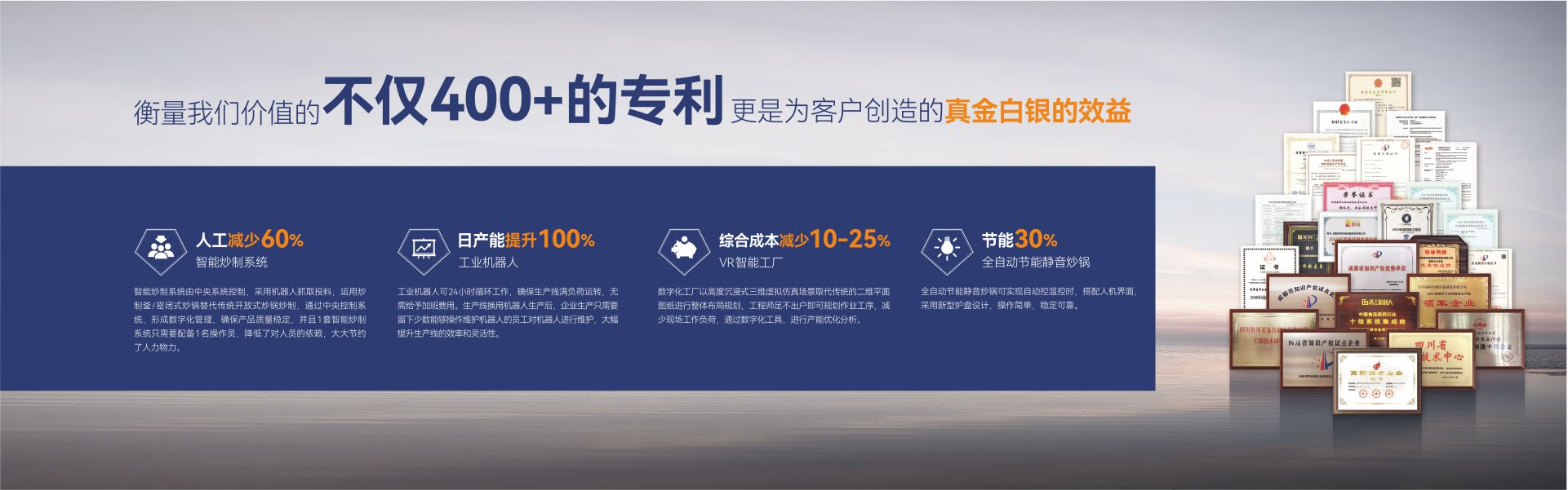 成都??茩C械設備制造有限公司(簡稱:成都??疲┦且患壹邪l(fā)、生產、銷售、服務為一體,專注為中國傳統食品行業(yè)提供自動化、智能化、數字化、智慧工廠整體解決方案的國家級高新技術企業(yè)。公司擁有標準化辦公樓及現代化生產車間約42000m2,具有較強的綜合研制、設計開發(fā)、生產能力,具備嚴格的質量管理體系和完善的售后服務體系。公司業(yè)務范圍覆蓋:復合調味品智能生產線、中式醬鹵肉制品智能生產線、醬腌菜智能生產線、智慧餐廚、央廚預制菜調理智能生產線,與海底撈、天味、九毛九、聚慧、楊國福、絕味、雙匯、新希望、無窮、烏江、吉香居、仲景、李記樂寶、Tyson、益海嘉里、開小灶、老鄉(xiāng)雞等眾多知名企業(yè)合作。截止目前,成都??埔呀浿Τ?000+企業(yè)順利投產5000余條生產線,為客戶創(chuàng)造年產值超1000億元!